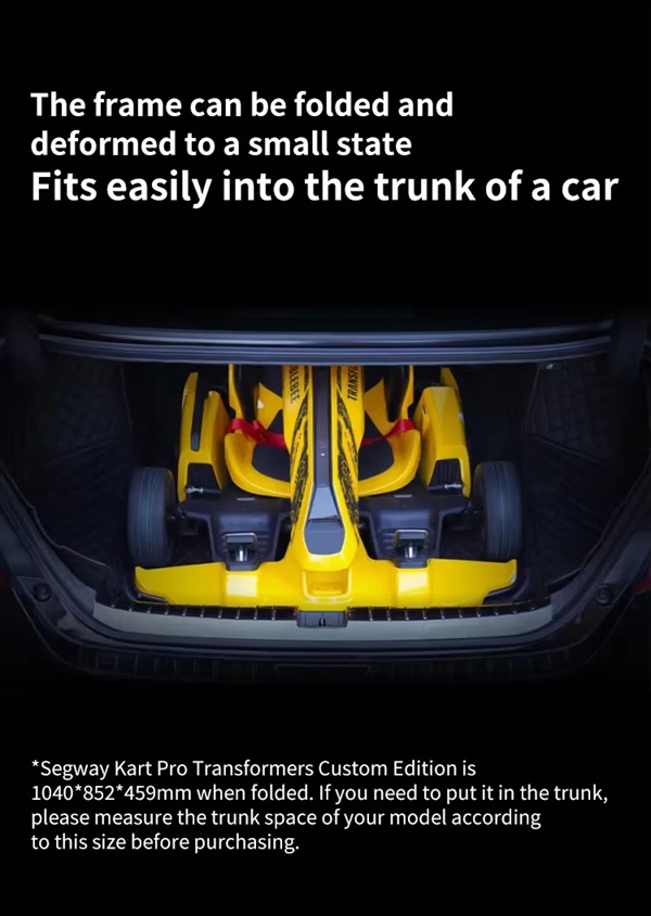 The Bumblebee Segway Gokart Pro is designed for ultimate convenience, easily collapsing to fit into most vehicle trunks. This means you can effortlessly take your adventure anywhere, ensuring the fun is always within reach!